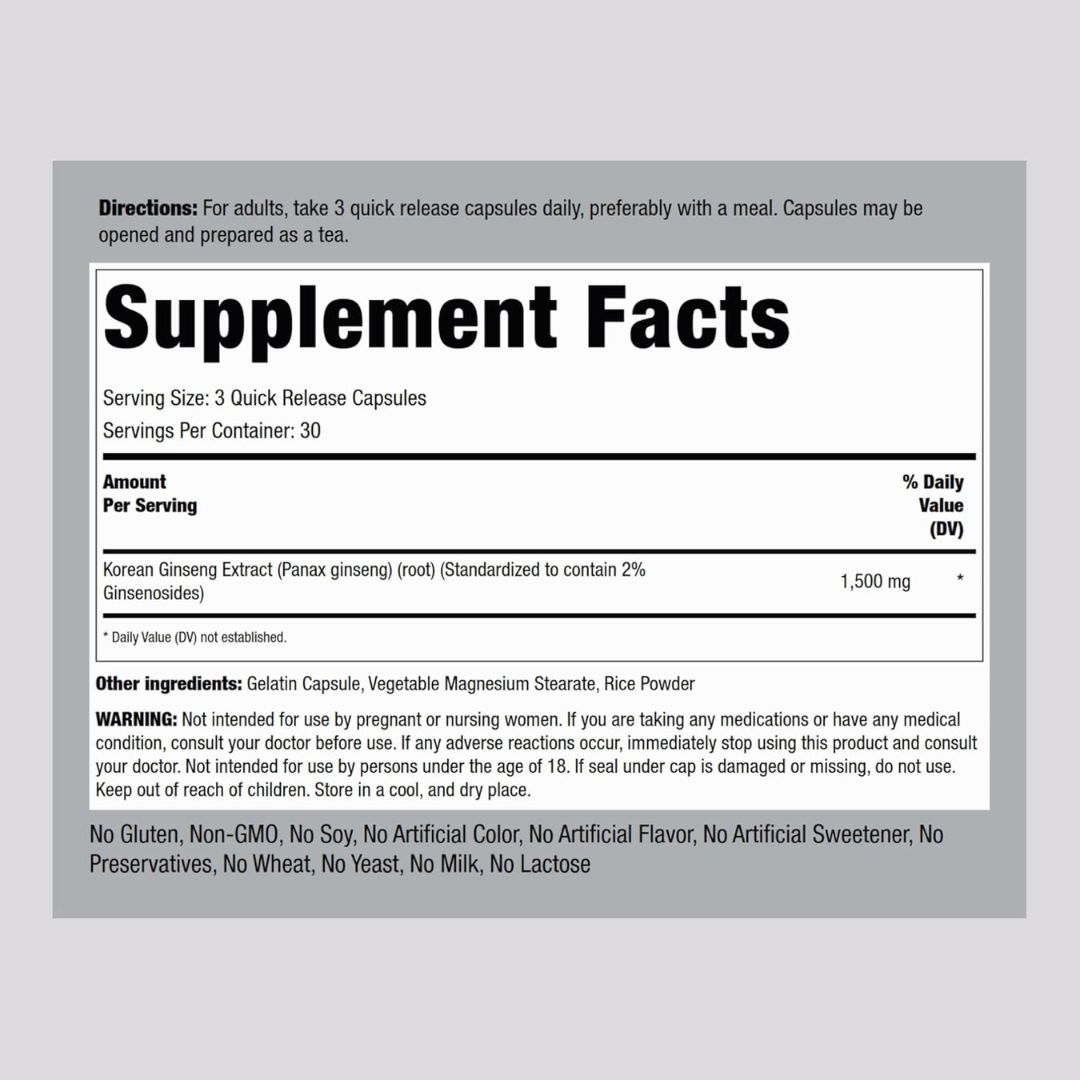 Piping Rock. Ginseng Coreano 1,500 mg- Por cada 3 cápsulas – 90 cápsulas por frasco.